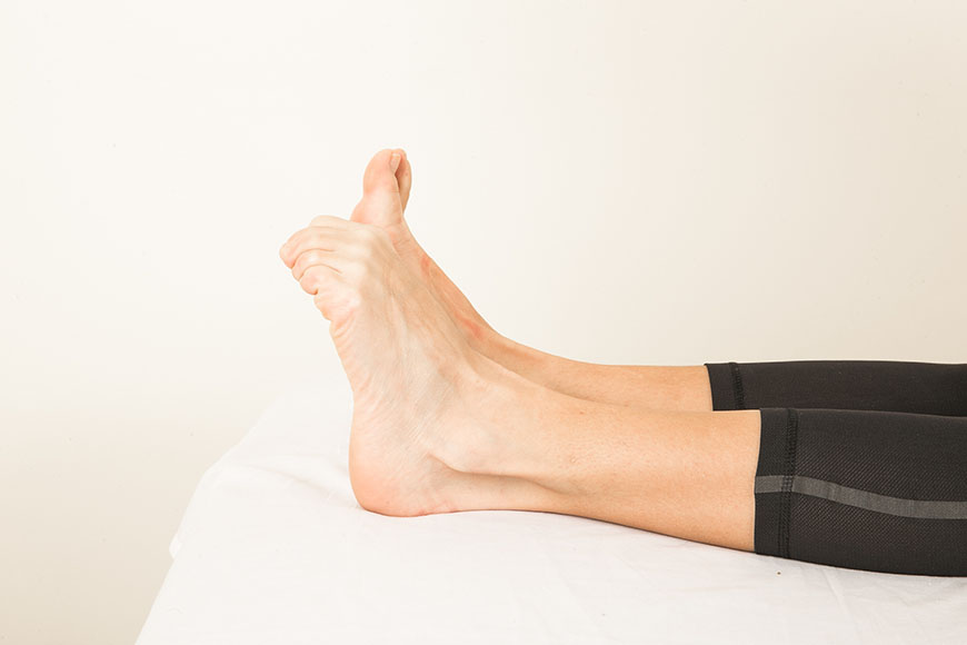 -Sit on the floor with your legs stretched out in front of you. -Loop a resistance band around the ball of your right foot. -Grasp one end of the band with your right hand and the other with your left hand. -Point your ankle against the resistance of the band. -Then, without changing the pointed position of your ankle, relax your toes so they point up toward the ceiling. -Point and flex your toes, keeping your ankle stationary, for a total of 10 repetitions. -Repeat with the left foot.